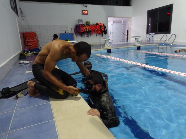ثم ينتقل المتدرب الي حصص العملي في حوض السباحة للتدريب علي ما تم تلقينه في حصص النظري من كيفية كثم النفس الاستاتيكي Static والداينامك Dynamic مع الزعانف وتمارين لزيادة سعة الرئة وغير ذلك من التفاصيل ,